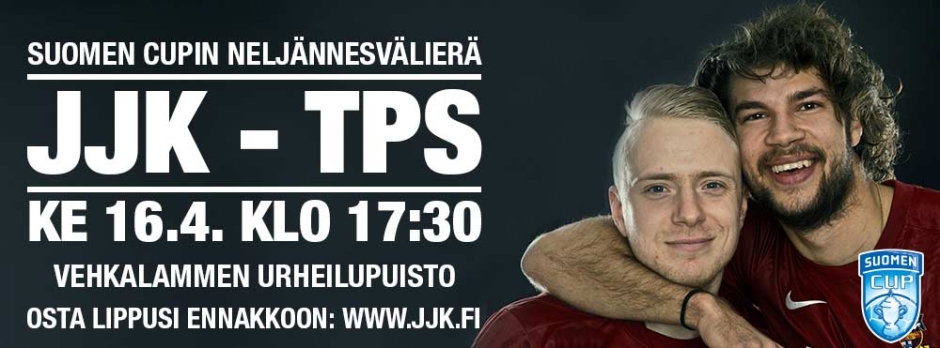 Suomen Cupin neljännesvälieräottelu JJK-TPS keskiviikkona 16.4. klo 17:30 Vehkalammen urheilupuistossa Jyväskylässä. Liput ennakkomyynnissä JJK:n verkkokaupassa klo 15:00 asti, hinnat 7/4€. Pääsyliput portilta 10/6€, kausikorttilaiset pääsevät sisään sanomalla nimensä portilla.