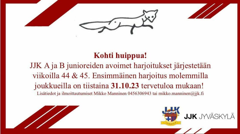 JJK B- (U17) ja A-junioreiden (U20) avoimet harjoitukset on suunnattu tavoitteellisille 14-20-vuotiaille jalkapalloilijoille (2009-2003 syntyneet). Avoimet harjoitukset järjestetään viikoilla 44-45, ilmoittaudu rohkeasti mukaan!