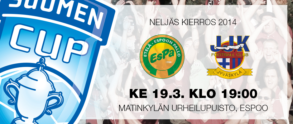 Tänään keskiviikkona on luvassa JJK:n kauden toinen kilpailullinen ottelu kun Suomen Cupin neljäs kierros saattelee suojattimme kohti Espoon sydänseutuja. Illan kamppailun kotijoukkueena on Etelä-Espoon Pallo eli EsPa ja ottelu pelataan Matinkylän urheilupuiston tekonurmella klo 19:00.