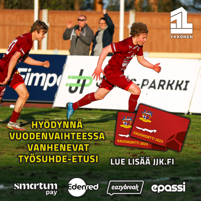 Mikäli haluat maksaa korttisi Edenred Pay:lla, voit suorittaa maksun MyEdenred-sovelluksessa. Avaa MyEdenred-sovellus ja valitse ’Luo Mobiilimaksu’ ja käyttöpaikaksi ’JJK Jyväskylä’. Syötä summaksi kausikortin hinta 119€ ja kirjoita lisätietoja-kenttään sähköpostiosoitteesi mahdollista yhteydenottoamme varten. Vahvista maksu. Halutessasi voit maksaa myös osan kortista Edenredillä ja loppuosan muulla maksutavalla, laita silloin viestiä sanna.kahila(at)jjk.fi