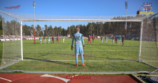 EIF-JJK ottelussa nähtiin lauantaina kaksi rangaistuspotkua, kuten nähtiin Harjullakin joukkueiden kohdatessa. Kuvassa valmistaudutaan JJK:n rangaistuspotkuun 13. toukokuuta – pallon verkkoon ampui tuolloinkin Saku Leppänen.