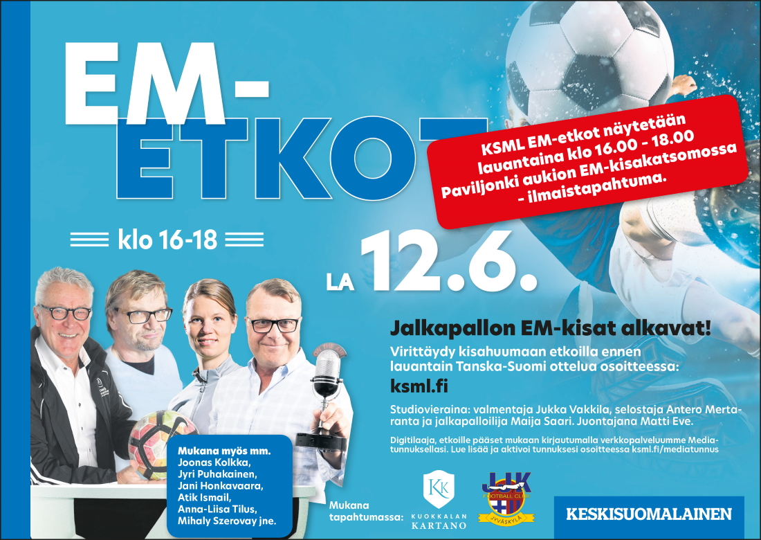 Ennen varsinaista ottelulähetystä voit seurata screeniltä Keskisuomalaisen EM-Etkoja (klo 16-18).