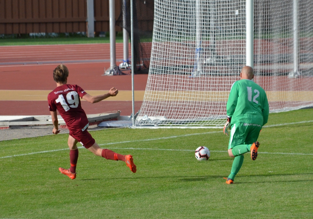 Kemppainen hassutteli pallon AC Barca -vahdin taakse heinäkuussa Harjulla