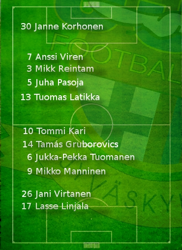 JJK:n avauskokoonpano: Korhonen; Virén, Reintam, Pasoja, Latikka; Kari, Tuomanen, Gruborovics, Manninen; Virtanen, Linjala
