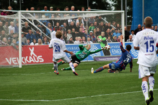 Korhonen pelasi JJK:n maalilla 2010-2015 – tässä hän pysäyttää HJK:ssa pelanneen Teemu Pukin laukauksen.