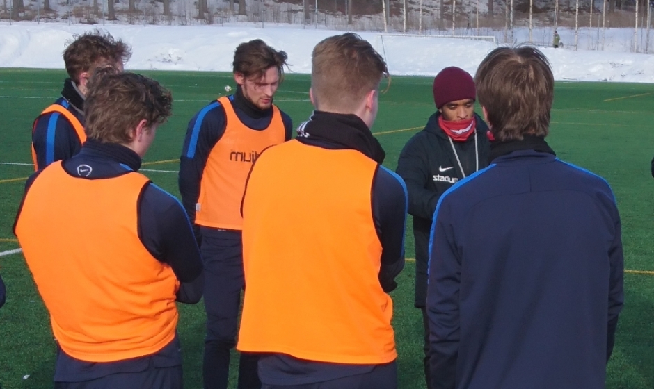 Valmentaja Elfadlin ohjeita kuunteleva Robin Saastamoinen osui kertaalleen viime sunnuntain harjoitusottelussa FCV:tä vastaan.