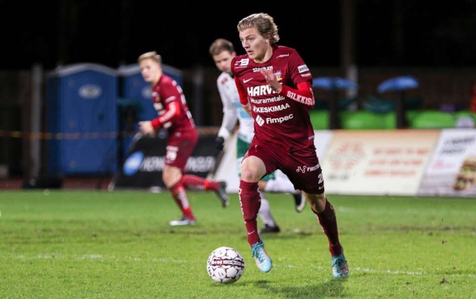 Aatu Manninen viilettää Harjun Stadionilla IFK Mariehamnia vastaan pelatussa voitokkaassa Veikkausliiga-ottelussa syksyllä 2017