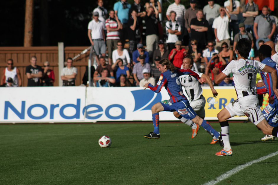 JJK:n ja TPS:n väliset kohtaamiset ovat usein olleet tiukkoja ja tapahtumarikkaita. Tässä Manninen viilettämässä karkuun ex-joukkuetovereiltaan kesällä 2011 1-1-tasuriin päättyneessä pelissä.