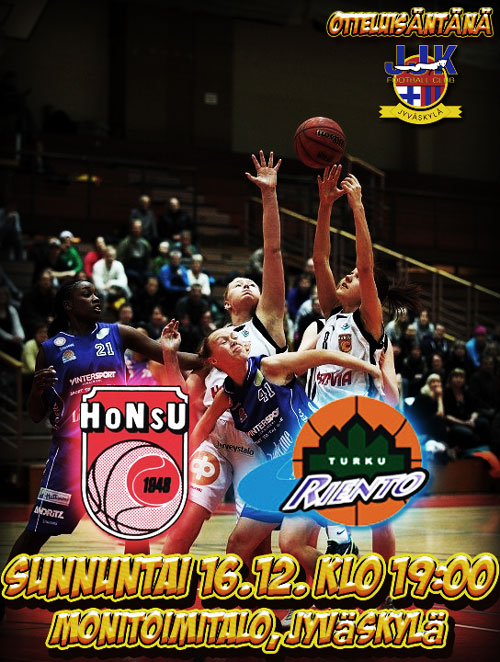 Naisten SM-sarjan koripallo-ottelu HoNsU vs. Turun Riento sunnuntaina 16.12. klo 19:00 Monitoimitalolla Jyväskylässä. Aikuiset 7€, eläkeläiset ja opiskelijat 5€, alle 16 v. 2€ – tervetuloa! Otteluisäntä JJK valitsee ottelun parhaat pelaajat.