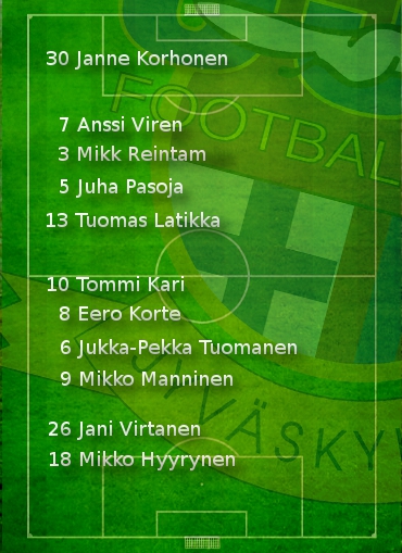 JJK:n avaus: Korhonen; Virén, Reintam, Pasoja, Latikka; Kari, Korte, Tuomanen, Manninen; Virtanen, Hyyrynen.