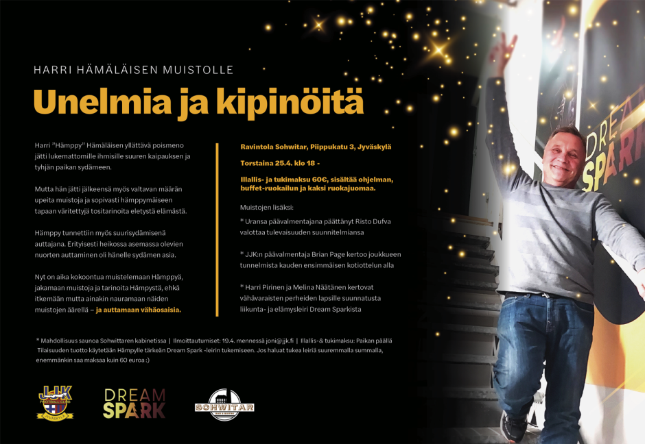 Tilaisuuden tuotto käytetään Hämpylle tärkeän Dream Spark -leirin tukemiseen. Jos haluat tukea leiriä suuremmalla summalla, enemmänkin saa maksaa kuin 60 euroa 🙂