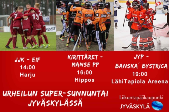Tämän viikon sunnuntaina, 9. syyskuuta, tarjoavat jyväskyläläiset palloiluseurat JJK, Kirittäret ja JYP melkoisen urheilun Super-Sunnuntain. JJK:n ottelu EIF:ää vastaan siirrettiin alkavaksi klo 14:00, jottei yksikään kolmesta hienosta tapahtumasta mene päällekkäin. Kiitos tästä ottelusiirtoon suostuneille Palloliitolle ja vastustaja EIF:lle sekä kiitos loistavasta yhteistyöstä Kirittärille ja JYPille. Super-Sunnuntaissa on vahvasti mukana myös Jyväskylän kaupunki, joka toimii otteluisäntänä niin Kirittärien kuin JJK:n matseissa.