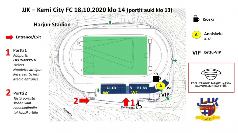 Luethan alta tapahtumaan saapuville tarkoitetut ohjeet huolellisesti, ne sisältävät paljon tärkeitä huomioita. JJK pyytää yleisöä saapumaan hyvissä ajoin stadionille, jotta jonoja ei synny ja sisäänkäynti olisi mahdollisimman sujuvaa ja turvallista.